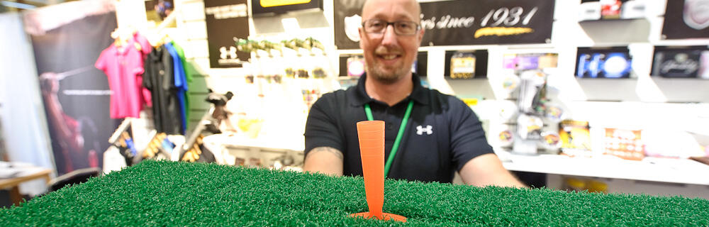 Prestige Golf har en mängd sköna tillbehör i sin monter. Allt ifrån en innovativ peg till fyrhjuliga vagnar och golfbollar för nattspel.