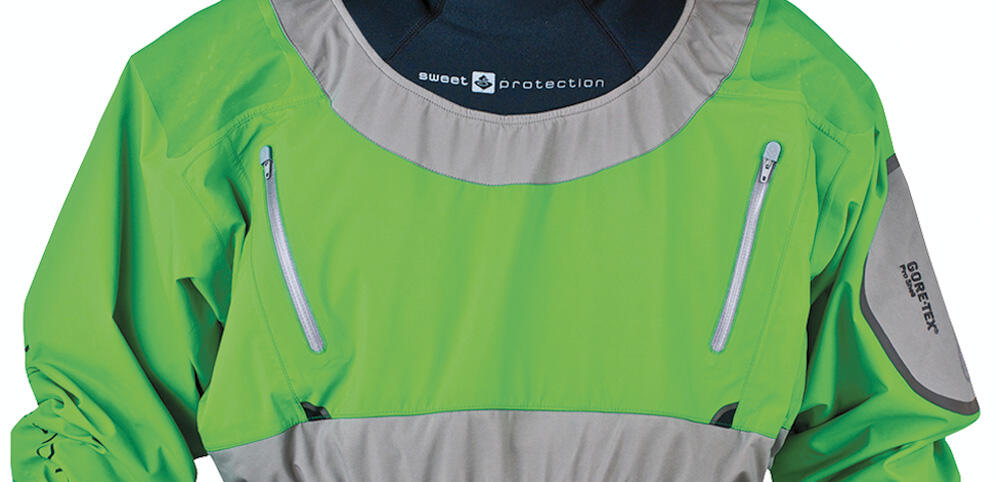 Sweet Prophecy Dry Top är den första forspaddlingsjackan från norska Sweet. Den är gjord med Gore-Tex för att vara vattentät och andas. I ärm och hals är det latex och neopren för att inte släppa in vatten. Midjan är av neopren och ser till att sluta tätt runt kapellet. En bröstficka med två ingångar och
