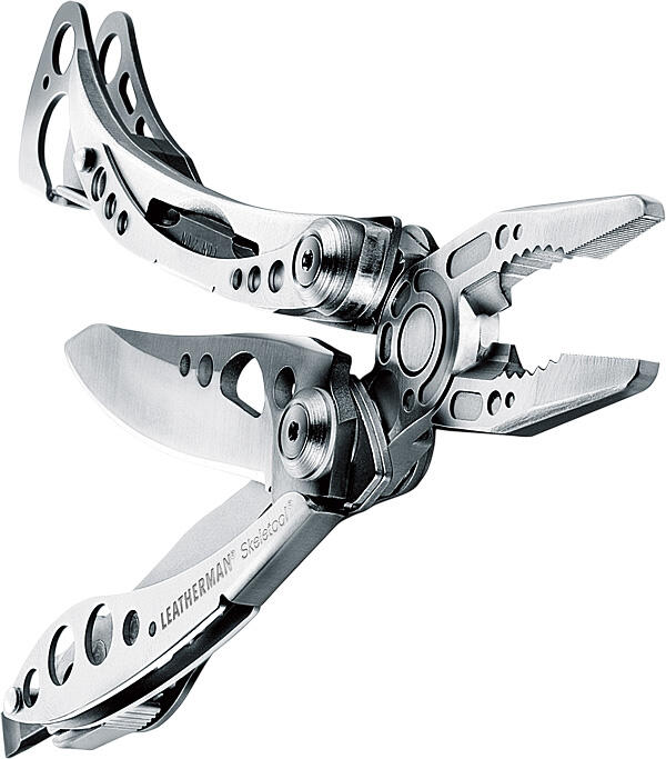 Verktygslåda i fickformat Kalla aldrig en Leatherman för en fickkniv. Multiverktyg eller verktygslåda i fickformat är mycket bättre benämningar. Nya Leatherman Skeletool har en helt ny form för att både ligga bättre i handen och väga mindre. De böjda greppen ligger bra i handen och de utstansade hålen gör att verktyget bara väger 142 gram