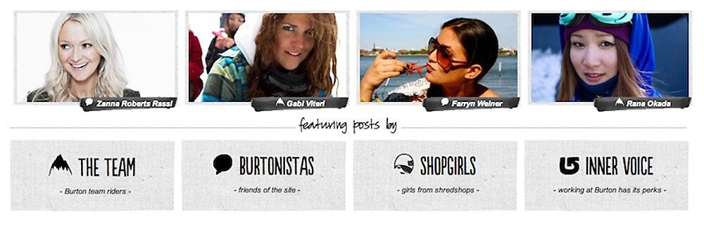 Förutom att Burtons kvinnliga teamåkare delar med sig av sina tips och upplevelser så har Burton också kopplat skådespelare, DJ:s, fotomodeller, kvinnor som jobbar på Burton och kvinnor som jobbar i snowboardbutiker till sajten.