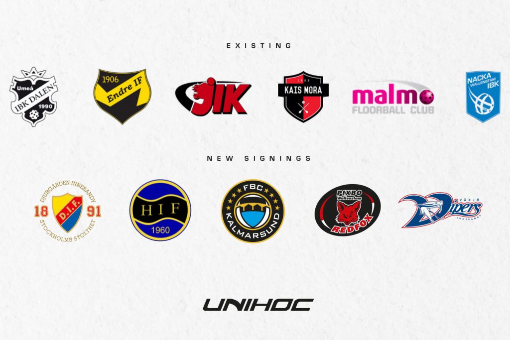 Inför den kommande säsongen har man nu gjort klart med FBC Kalmarsund, Växjö Vipers, Djurgårdens IF, Hagunda IF och Pixbo Wallenstam. Sedan många år arbetar man redan med SSL-föreningarna IBK Dalen, Jönköpings IK, KAIS Mora, Malmö FBC, Endre IF och Nacka Wallenstam. Totalt sett kommer Unihoc nu att arbeta tillsammans med 11 SSL-föreningar, så jämnt som möjligt fördelade på både dam- och herrsidan.