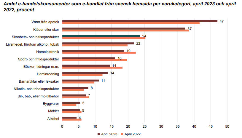 Totalt minskade e-handeln med 2 procent i april jämfört med året innan och hittills har vi tappat 4 procent under hela 2023. I allmänhet är det nikotinprodukter och apoteksvaror som går bäst på nätet just nu. Sport- och fritidsprodukter minskade med fyra procentenheter vilket är en av de största minskningarna i de olika segmenten som Svensk Handel kartlägger. Men sport- och fritidsprodukter har dock visat sig få en viss konkurrens av den vanliga konfektionsbranschen, då kläder och skor gör en ökning på 1 procentenhet.